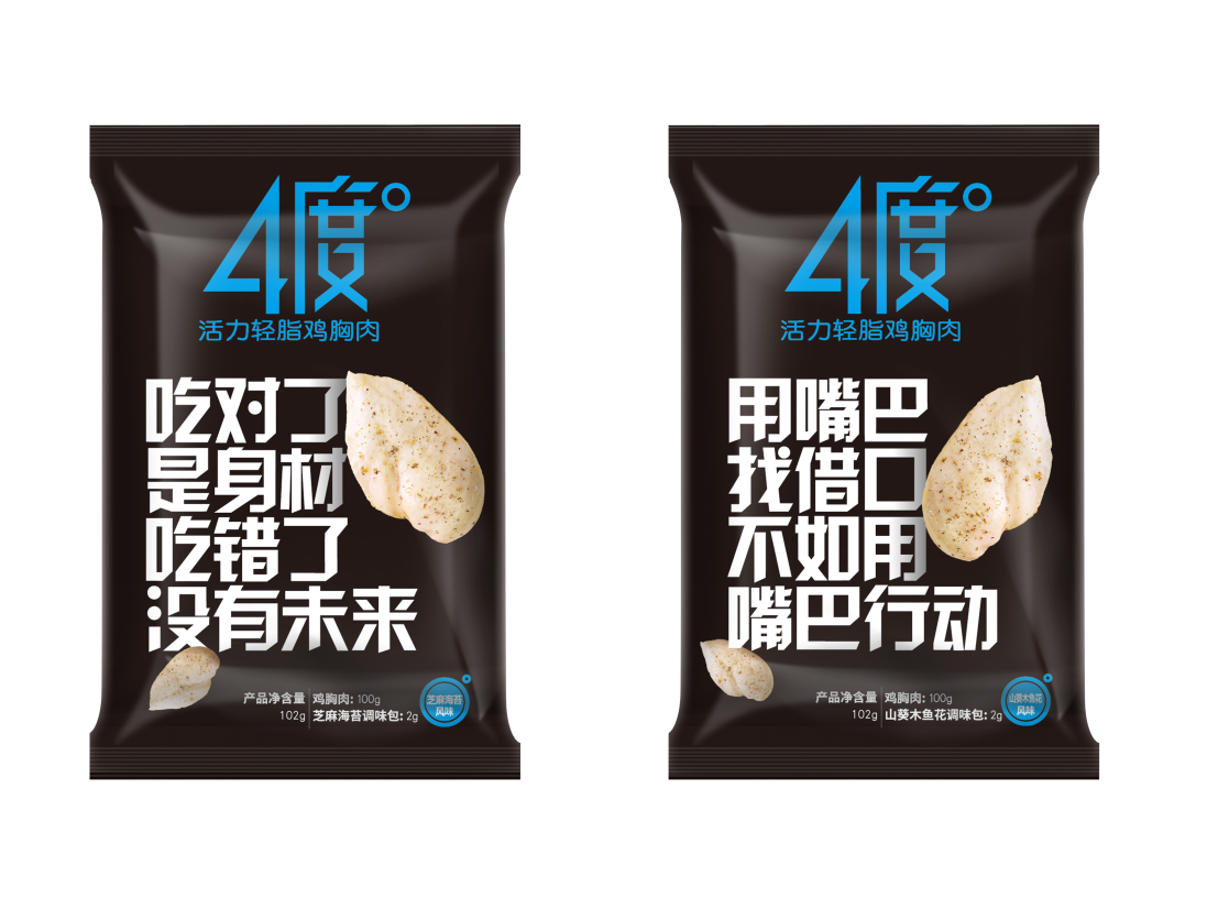 4度°活力轻脂鸡胸肉,利用鸡胸肉低脂肪低热量特点而打造出的一款鸡胸肉产品,可由消费者自行搭配各类蔬菜、水果组成活力轻脂餐,保卫减肥成果。